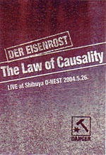 The same goes for sound: it is far from flawless, and there are no sound quality options on the disc, but that somehow feels just right for the mood of the concert. Even the cute typoes here and there in the texts emphasize the impression of a punk-spirited carelessness while everything is actually permeated by clearly evident professionalism. A few moments of both sound and video (especially during the grainy Another Muggy Day) may give a viewer some headache, but that's a small price to pay for getting to experience feel of the event as it seems to have been. Especially the Finnish public I represent will probably have precisely the right attitude for it all: the Japanese crowd seen on the film seems to behave identically to the the famous "passive Finnish industrial audience". The songs on the DVD have been selected from among the band's long career, ranging from the first tape to the quite recent compilation track Down by Law. The sound-style Der Eisenrost uses is best described to a Western reader as and imagined, extremely skilled hard core punk band playing their impression of what a bunch of Front Line Assembly cover tracks made by Prong would sound like. None of the songs rises above the others in qulity or impact, but neither are there any weak moments along the way. The percussions, vocals, electric guitar and bass all get their share of dominating the show. The most visually intriguing parts are the wide images in Mix-J, which give a good look at the metal-beaters' and drummer's furious work, and the parts near the end where the camera concentrates on the intense metal-banging of the band's internationally most known member, the composer Chu Ishikawa. The Law of Causality is short, rough and damn fine. It requires the right attitude, but will really reward those who have an open enough view of what industrial or punk can include. Especially I recommend this DVD to those most likely to enjoy it - the people who have found industrial music through first liking punk. This is a disc that entertains, and stays with you long after you have closed the television. First-rate material. Jiituomas |