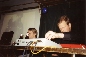 Des Esseintes is also an artist known for his talent in using background videos. Unlike BSE, Magnus Sundström does not edit his videos or make them go in beat with the music, prefering to coolly put on some stylish but not well-known horror movie. Usually the strong visual style of those works manages to capture the disturbing, oppressive feel inherent in Sundström's music. The performance started slowly, in a more death industrial mood, and then, song by song, brought forth rhythms created by beating drum pads. An excellent high point for the evening was a nicely primitive verion of the hit song King of the Jungle. We would once again like to thank the artists, all of the people who helped maake the show possible, and also all those who showed up. We'll meet again at the next KMY concert. Des Esseintes |