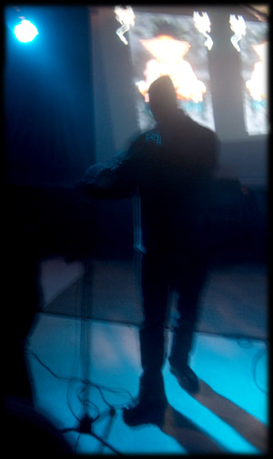 Beyond Sensory Experience (or justBSE) opened up by sitting behind their laptops, thus making the audience expect what is alreaady known as the "Swedish performance style", i.e. artists sitting at the laptop, sipping beer. The brilliance of their show did, however, become apparent as the background video unfolded. Unlike in an average dark ambient show, in which the backdrom is just a small thing to spice up the music, the video had a central emphasis in BSE's performance. There were several clips with their own plots, and the visual material followed the rhythm of the music extremely well. |