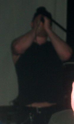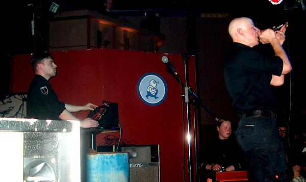 Gustaf Hildebrand (Swe) took advantage of the steel barrels that were on stage, and used them to make his soundscape more oppressive. Visions (Can) was quite melodic and surprisingly gloomy at the same time. Both of them used space-image backdrops that emphasized the mood of their music. Kammarheit (Swe) was unfortunately using both less stage activity than normal and a hastily put-together video, but that was no problem. The finely developing music combined nicely with the still images on the backdrop, and the static nature of the show became an advantage. The surprise performer of the evening, Northaunt (Nor) was the most scape-building artist in both melodical and mood-creating sense. All four shows were received by the audience as mostly sound and images in a space, and enjoyed in a calm but concentrating manner. The mood changed when Sophia (Swe) took the stage. Accompanied by a new assistant, Peter Bjärgö was as intense as ever. He was screaming fury into the hall while machines poured rhythm behind his voice, and drew his audience into the captivating force of his show. The evening's last act, Karjalan Sissit (Swe) divided audience opinions quite strongly. Markus Pesonen's alcohol-infused industrial was full of Nordic angst, and created a stereotypic image of Finnish masculinity that no native-born Finn could ever match. While one part of the audience was having wild fun in front of the stage, the other part found the show very hard to like. Yet no one was left without a clear opinion about it, one way or the other.